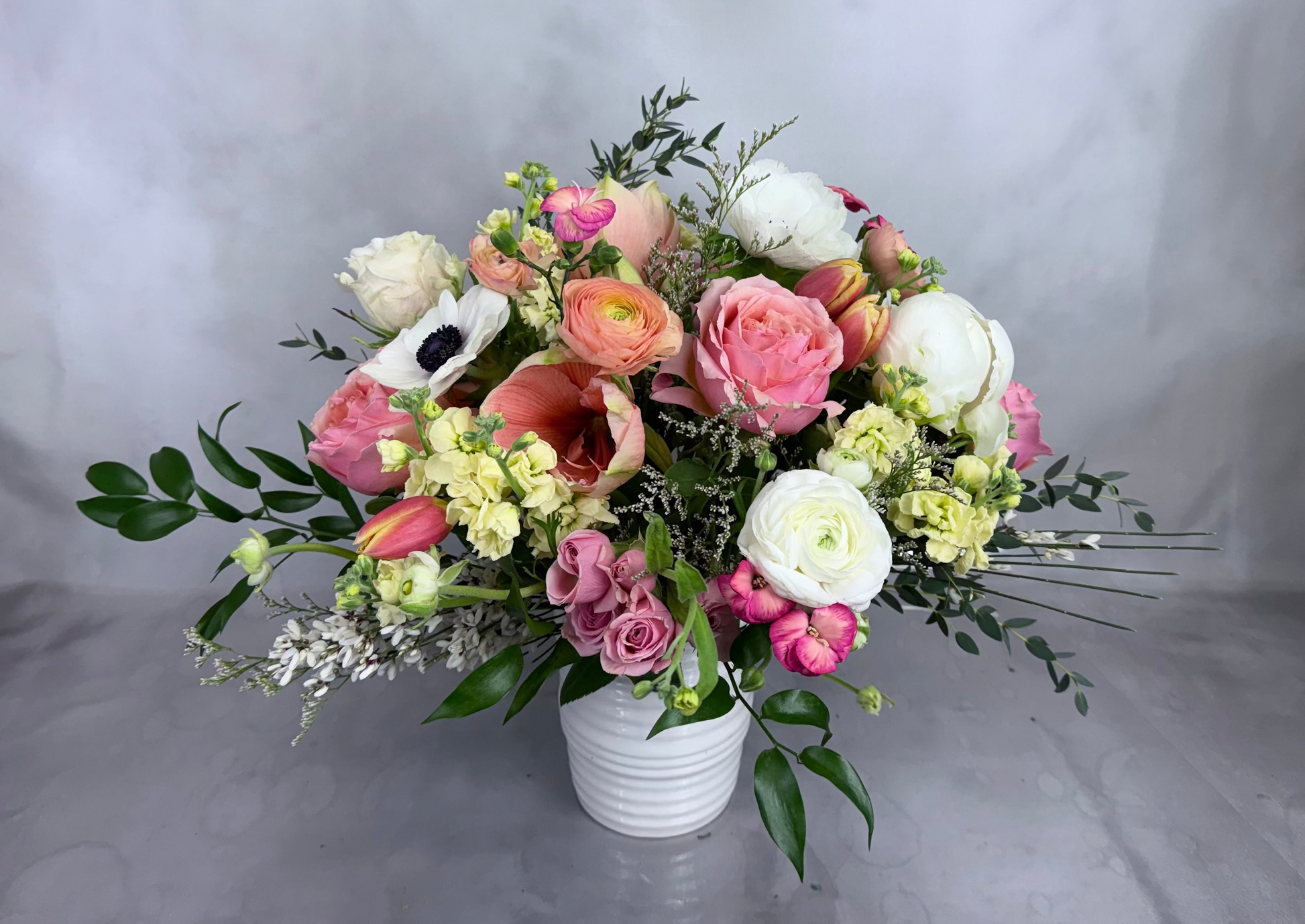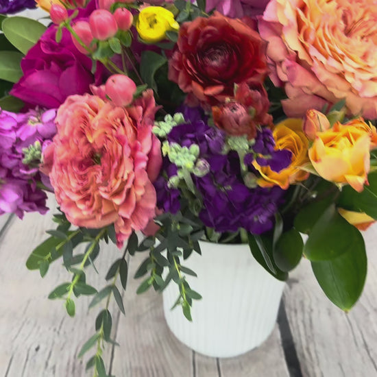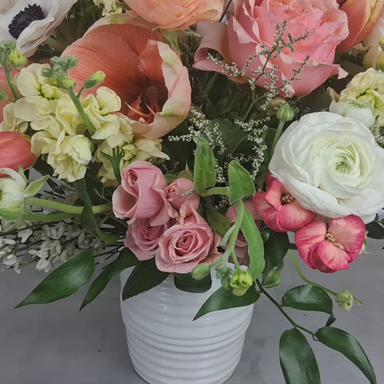 Lulu flower arrangements are made with seasonal flowers and designed with 6-7 different types of flowers in harmonious colors. Additionally, premium flowers are added to enhance their elegance