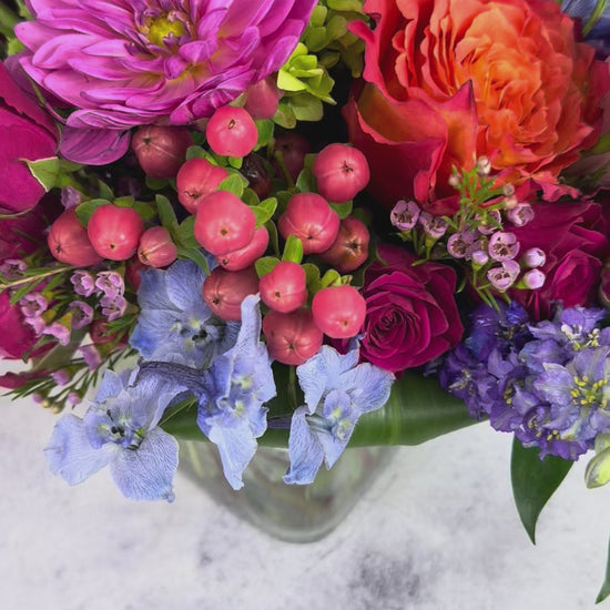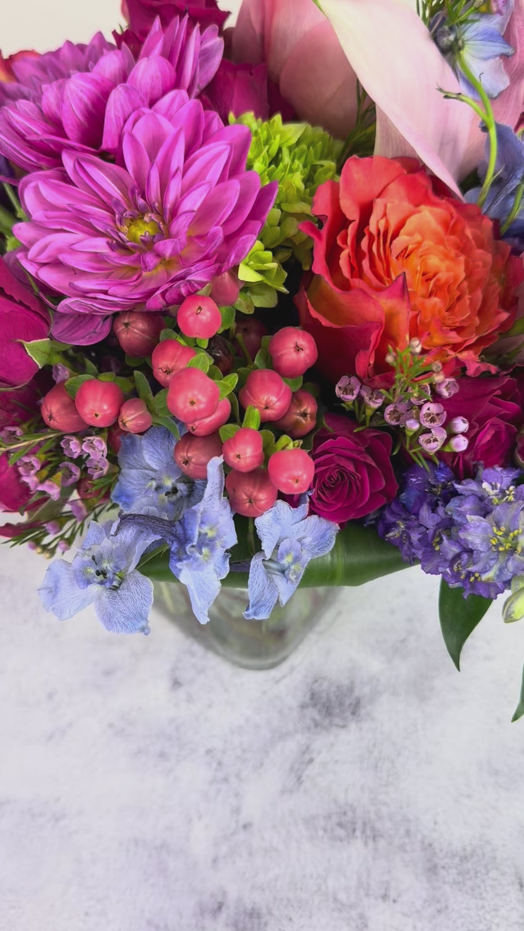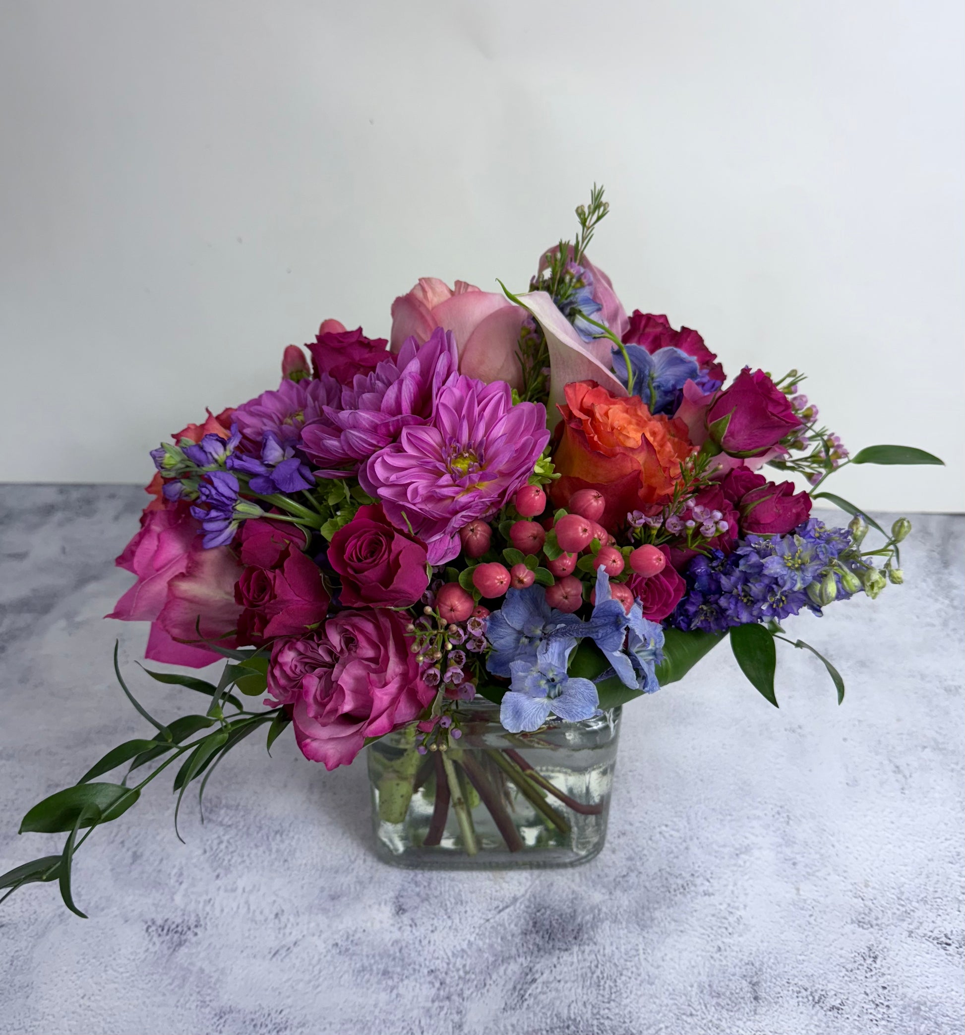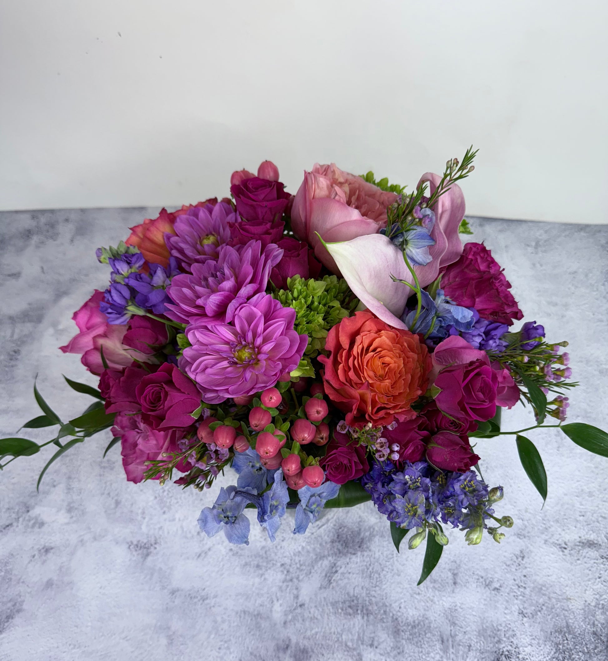 Reminiscent of a traditional English garden, this arrangement combines rare shades of bright toned colors to give off a calm yet preppy image. It serves as a perfect household or business decoration, inviting guests to feel comfortable with its outgoing palette.