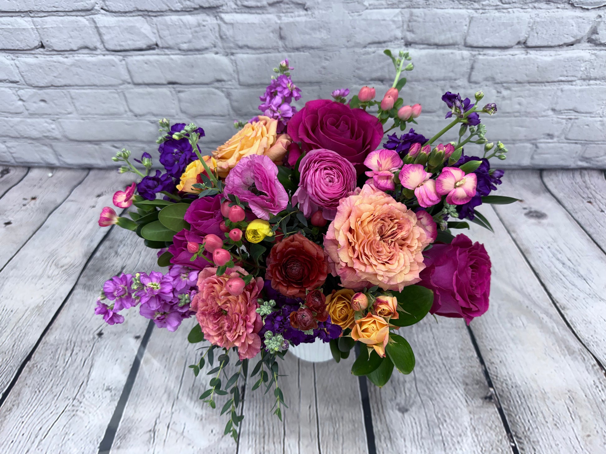 Reminiscent of a traditional English garden, this arrangement combines rare shades of bright toned colors to give off a calm yet preppy image. It serves as a perfect household or business decoration, inviting guests to feel comfortable with its outgoing palette.