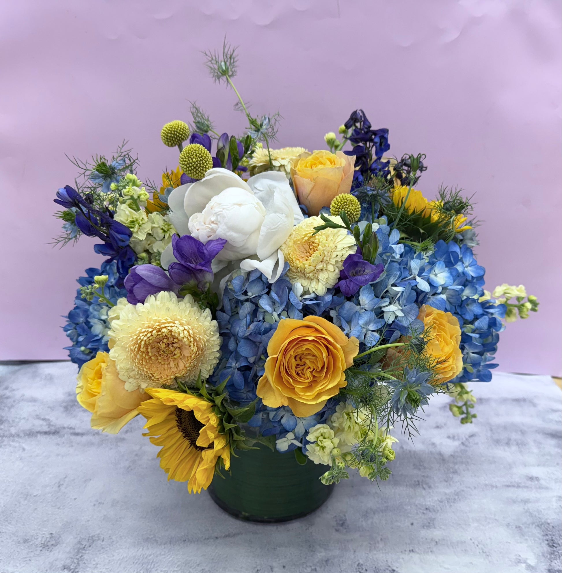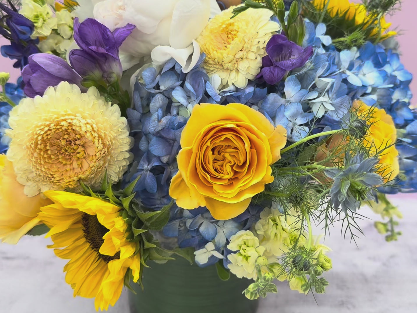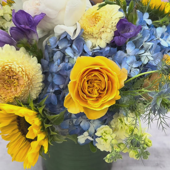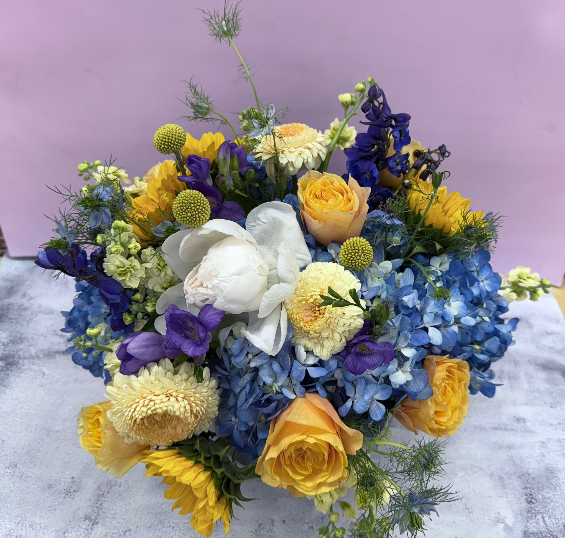 This arrangement, harmonized by the striking contrast of vibrant blue and yellow, suits someone as special as you and announces the arrival of spring.