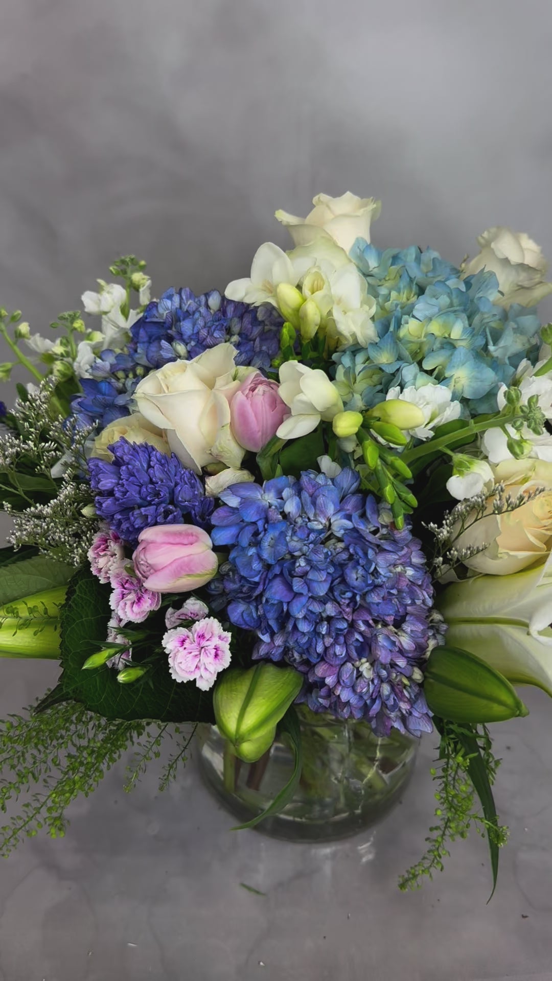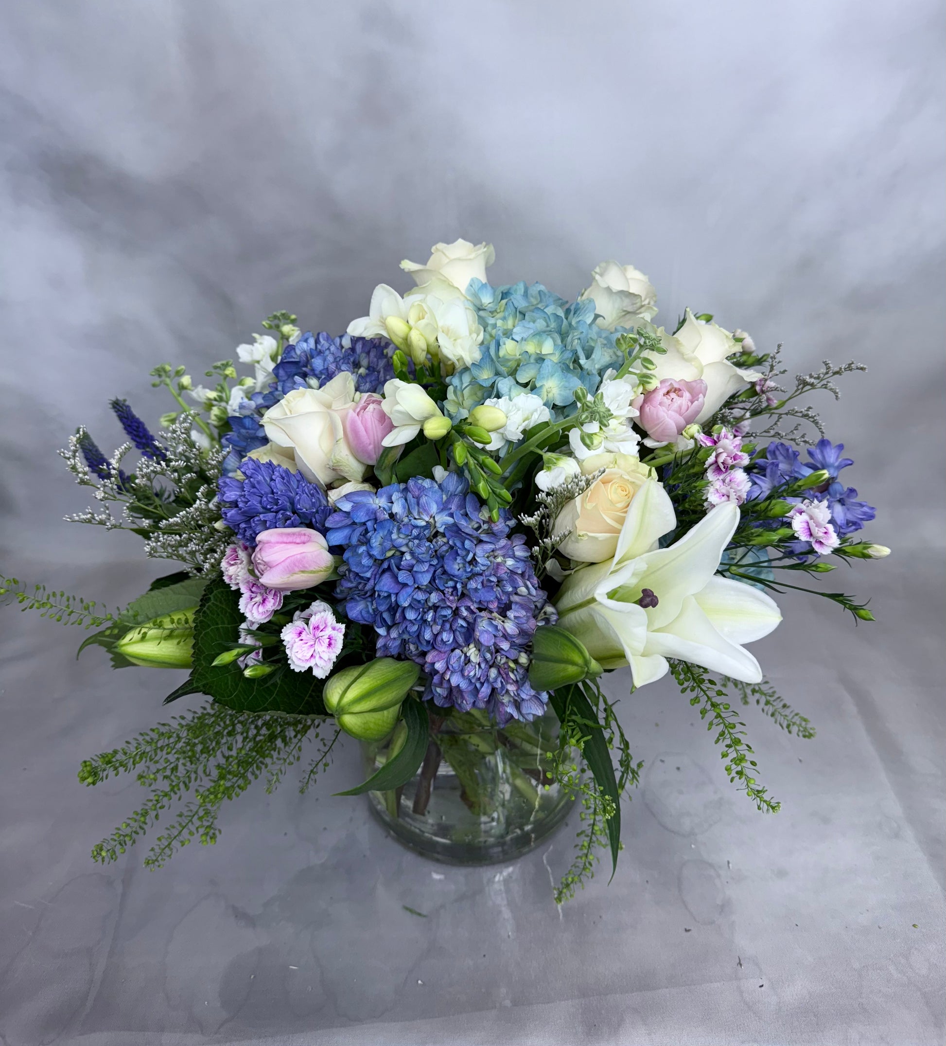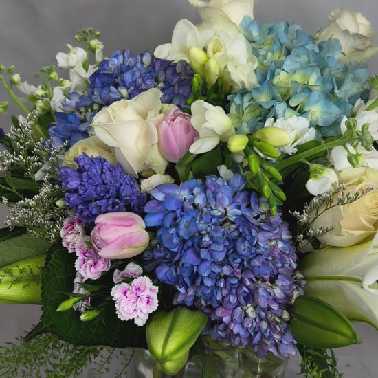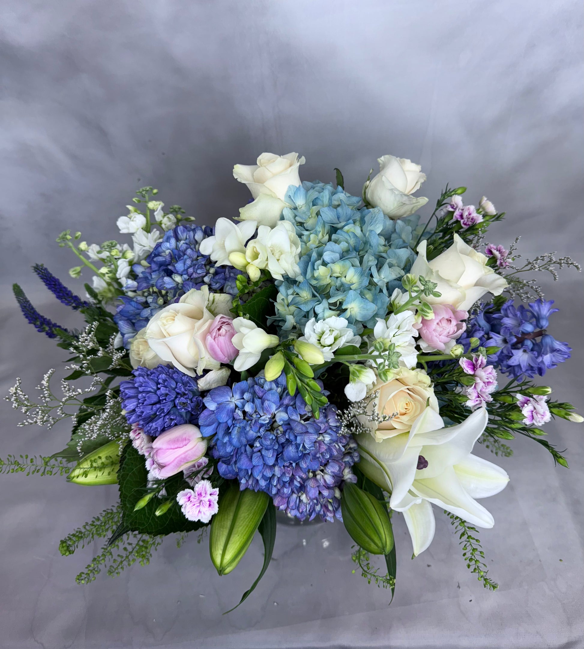 This flower arrangement combines various textures of white with a touch of light blue, adding a refreshing feel.